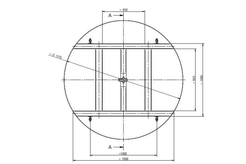 Trawersa przystosowana do zawieszenia na haku dźwignicy. Obręcz trawersy pozwala na uniknięcie kolizji z otoczeniem podczas procesu transportowania worka z ładunkiem. Prezentowane urządzenie stanowi przykład specjalnego rozwiązania technicznego, zaprojektowanego i wykonanego pod jednostkowe uwarunkowania.