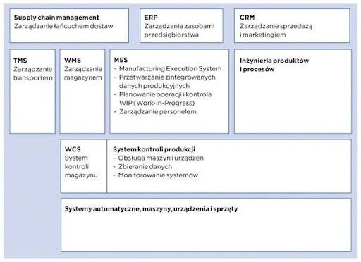 Producenci używają systemów MES do regulacji i optymalizacji działania zakładów produkcyjnych, ale warto zadać sobie pytanie, jakie miejsce mogą zajmować te systemy w całej strukturze oprogramowania stosowanego w przedsiębiorstwie. Pomoże nam to zrozumieć poniższy schemat: