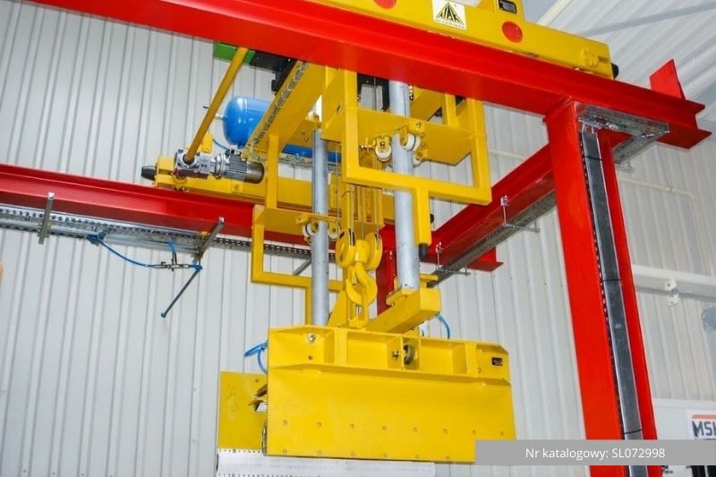 Urządzenie przeznaczone do dostarczania detali blach do pakietowania rdzenia generatora na stanowisko robocze. System transportu składa się z trzech dźwigników linowych umożliwiających transport blach na wysokość 8 200 mm z możliwością płynnej regulacji wysokości.